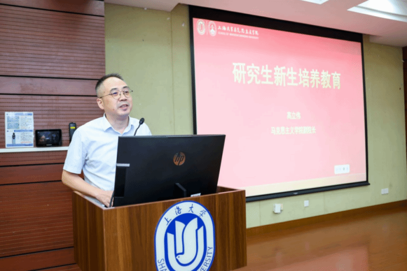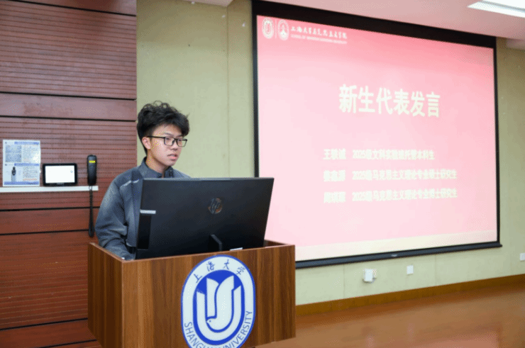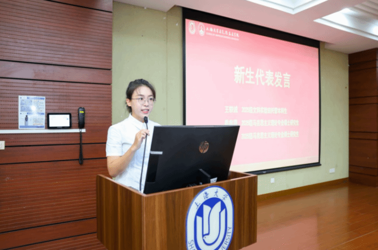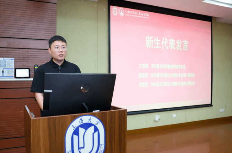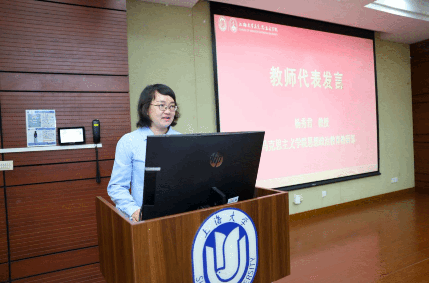 杨秀君教授作为教师代表发言。她结合自身多年的教学与研究经验,勉励新生要深植理论根基,做马克思主义的坚定信仰者;要坚持问题导向,做理论创新的积极探索者;要注重知行合一,做真理实践的自觉践行者;要坚守学术理想,做学风建设的模范引领者。同时提醒同学们关注心理健康,保持积极心态,传承好上大马院人的精神血脉,努力成长为担当民族复兴大任的时代新人。