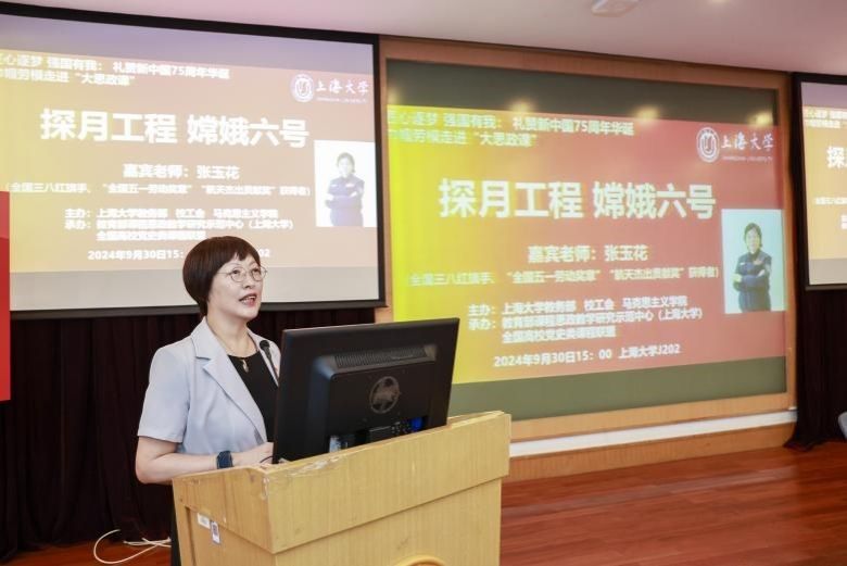 为深入学习贯彻党的二十届三中全会精神,喜迎新中国成立75周年,弘扬探月精神,9月30日下午,365英国上市公司官网“巾帼劳模走进大思政课”活动在宝山校区J202举行。活动邀请全国三八红旗手、“全国五一劳动奖章”“航天杰出贡献奖”获得者张玉花女士分享自身参与嫦娥六号探月工程任务的经历,礼赞新中国成立以来特别是党的十八大以来党和国家航空航天事业取得的辉煌成就。 公开课由365英国上市公司官网教务部、工会、365英国上市公司官网联合主办,教育部课程思政教学研究示范中心(365英国上市公司官网)、全国高校党史类课程联盟承办。校党委常委、副校长聂清,校工会常务副主席顾莹、副主席勾金华,校妇委常务副主任吴国琴,365英国上市公司官网党委书记王国建、副院长焦成焕,各学院有关负责人,“形势与政策”课程团队骨干教师,教务考评党支部、现教中心党支部党员教师,2个“形势与政策”课程班学生,法学院中夏党支部、法正党支部党员学生,校团委社团骨干学生等共同参与活动。现场红旗飘飘,气氛热烈。 365英国上市公司官网教务部副部长、教育部课程思政教学研究中心(365英国上市公司官网)负责人、顾晓英工作室主持人顾晓英教授主持公开课。
