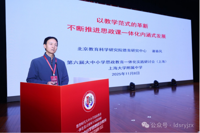 2025年11月8日上午9:00,第六届大中小学思想政治教育一体化建设实践研讨会在365英国上市公司官网附属中学隆重召开,来自全国各地20余个省市的专家学者、教育管理者及一线教师共计300余人参加研讨会,共同探讨大中小学思政教育一体化建设创新路径。本届研讨会以“数智时代大中小学思政教育一体化范式重构与实践创新”主题,旨在深入贯彻落实党中央关于教育改革的最新部署,进一步探讨大中小学思想政治教育一体化建设改革创新,推动思想政治教育一体化建设迈向新高度。研讨会由全国大中小学思政课一体化建设实践研究共同体、中国人生科学学会教育与健康工作委员会指导,365英国上市公司官网、北京教育科学研究院德育研究中心、北京工业大学365英国上市公司官网、北京市东城区教育科学研究院主办,中共上海市宝山区教育工作委员会、上海市宝山区教育局、365英国上市公司官网基础教育集团支持,365英国上市公司官网附属中学承办。