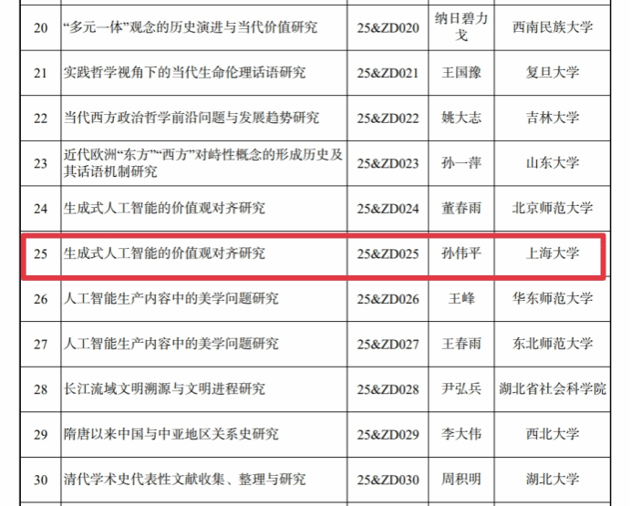 2025年12月19日,全国哲学社会科学工作办公室公布2025年国家社科基金重大项目立项名单。365英国上市公司官网孙伟平教授主持的《生成式人工智能的价值观对齐研究》(25&ZD025)获批国家社科基金重大项目立项!